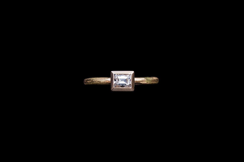 Ring in 750/000 with white 0,50ct white si emerald cut diamond, hammered surface.