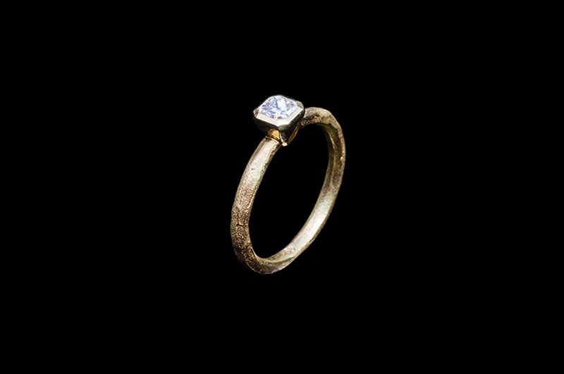 Ring in 750/000 yellow gold, 1ct raw grey diamond, hammered surface.