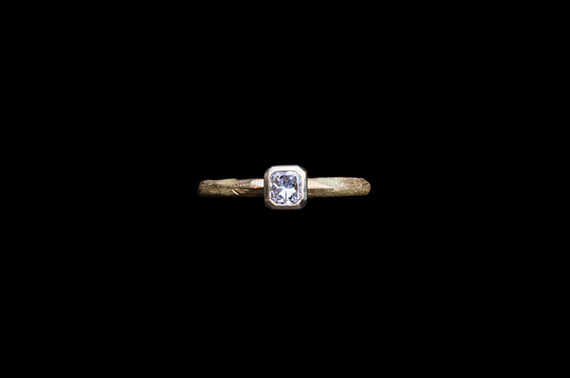 Ring in 750/000 with white 0,30ct white si cusion cut diamond, organic surface.